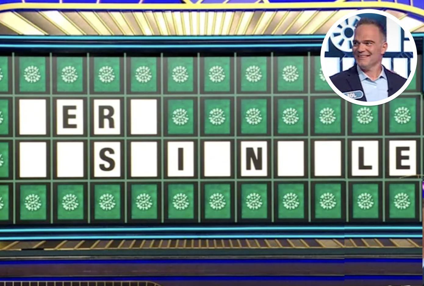 With his wife and daughter cheering from the sidelines, Ferroni entered the Bonus Round and selected the “Phrase” category. After being given the standard letters R, S, T, L, N, and E, he chose C, M, G, and I. Only one letter appeared on the board, leaving the puzzle as “ER _ S_I_N _LE.”